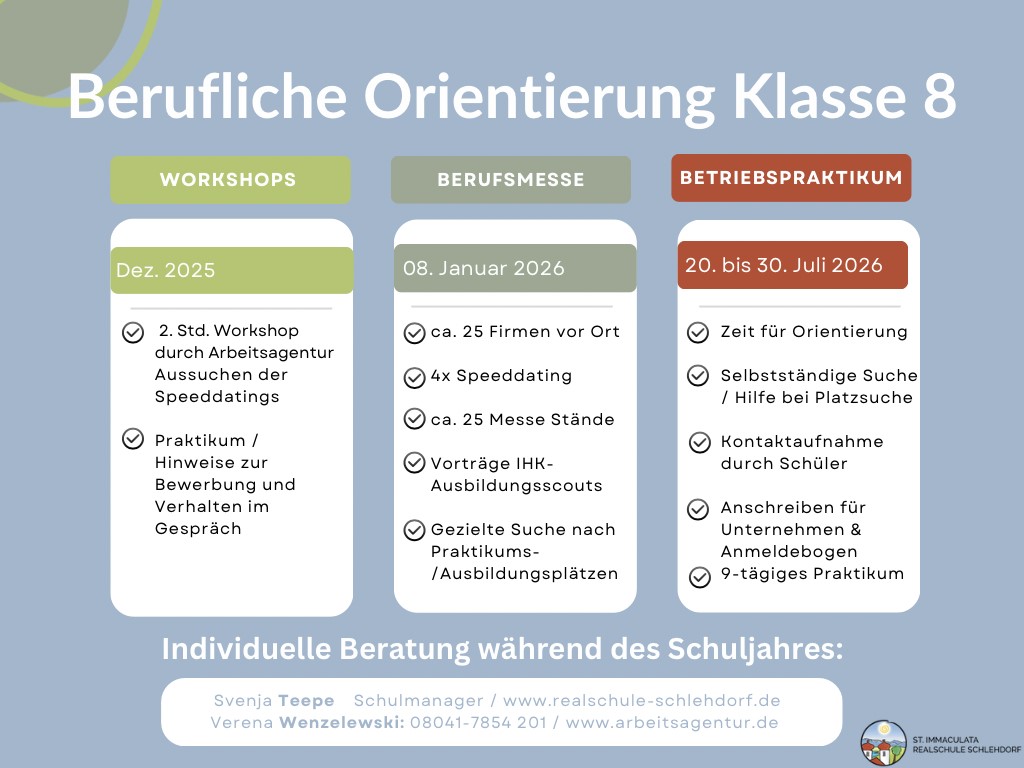 Die berufliche Zukunft unserer Schülerinnen und Schüler liegt uns daher besonders am Herzen. Deshalb legen wir an der Realschule Schlehdorf großen Wert auf eine frühzeitige und umfassende berufliche Orientierung. Bereits ab der 6. Jahrgangsstufe setzen wir gezielte Schwerpunkte, die die Jugendlichen auf ihrem Weg in die 10. Klasse und ins Berufsleben unterstützen.